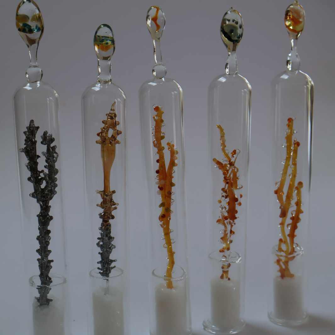 This installation continues my ongoing exploration of glass as a vessel for holding and preserving memories. Five decorative lampworked test tubes stand upright, each containing glass seaweeds formed in the...